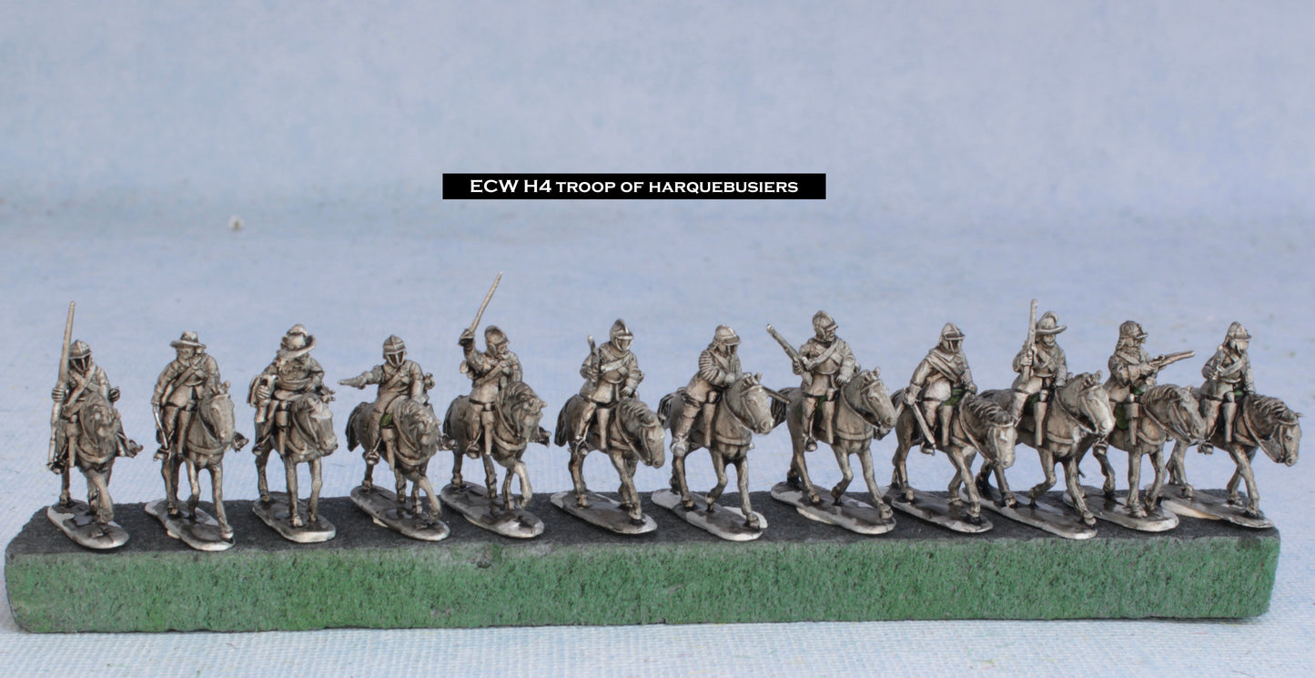 ECWH4 Troop of Harquebusiers. These became the standard shock cavalry as the war progressed, even though they only had medium weight equipment as opposed to the Cuirassier. This pack are equipped with carbines, brace of pistols, swords and medium weight armour. Interestingly relatively few men carried the carbine although they were still referred to as Harquebusiers. With this pack you can make a fully equipped Harquebusier Troop or you can mix them in with other units for variety.