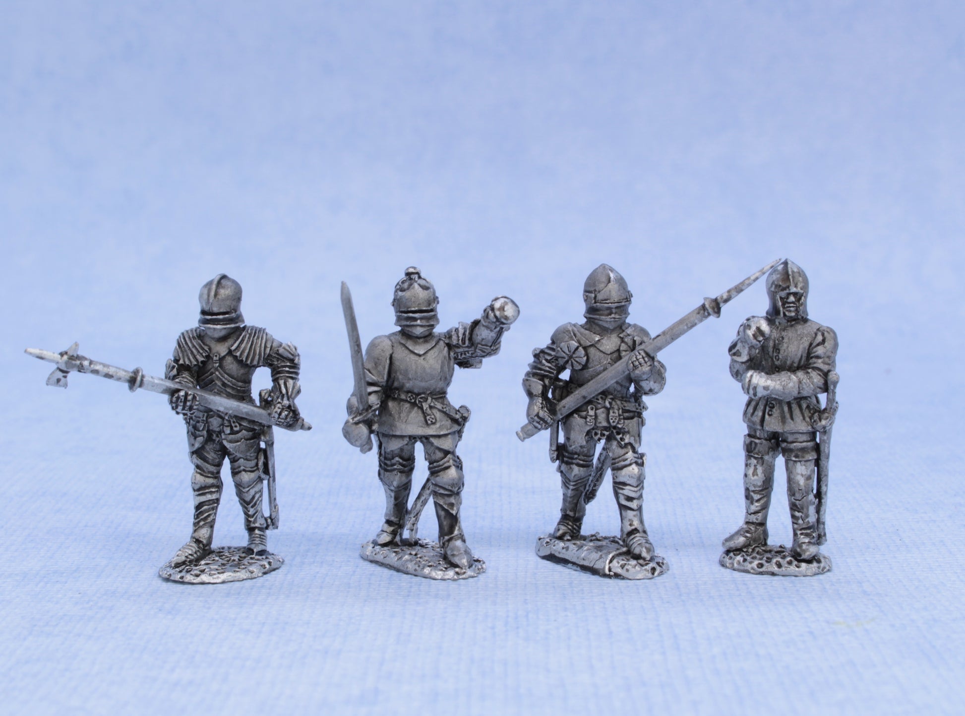 The knight on the left carries an alsphiss, a weapon designed to punch though plate armour. He wears a highly fluted and cusped european ‘gothic’ harness of the kind worn in Germany, France and less occasionally in England.