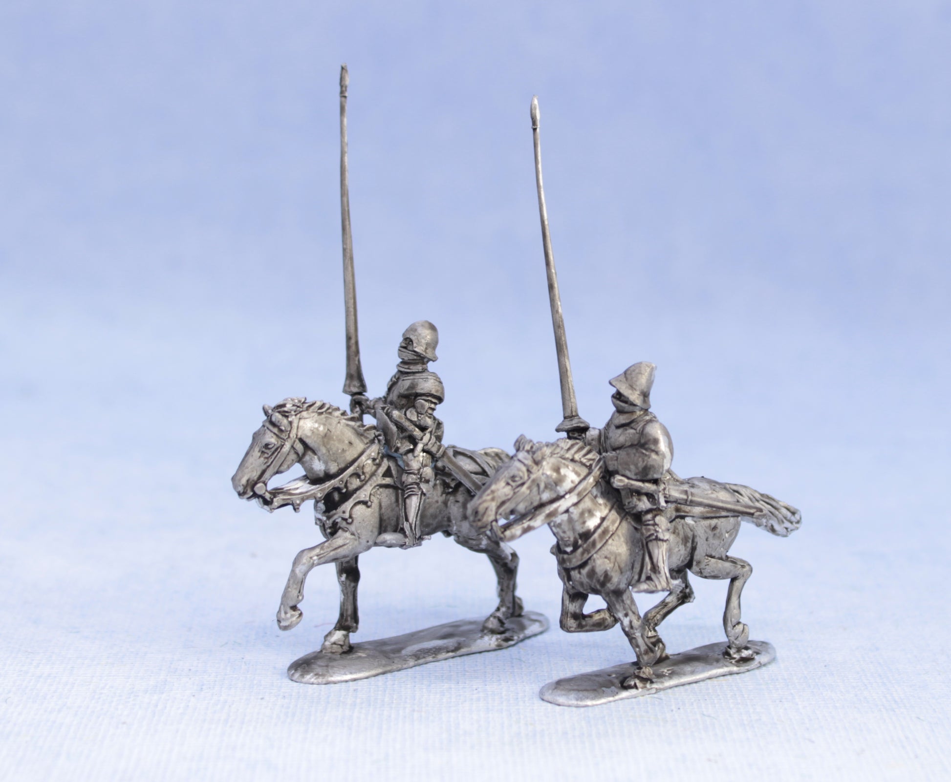 LM 4. Mounted Men at Arms. These are suitable for knights and men at arms for the period from circa 1470 to 1500, so can be used for Italians at the start of the Italian Wars. They carry heavy lances and wear kettlehelms which originate in Italy and Iberia, but which were exported across western Europe, so are suitable for many armies. The heads are separate items and so can be interchanged with other packs.
