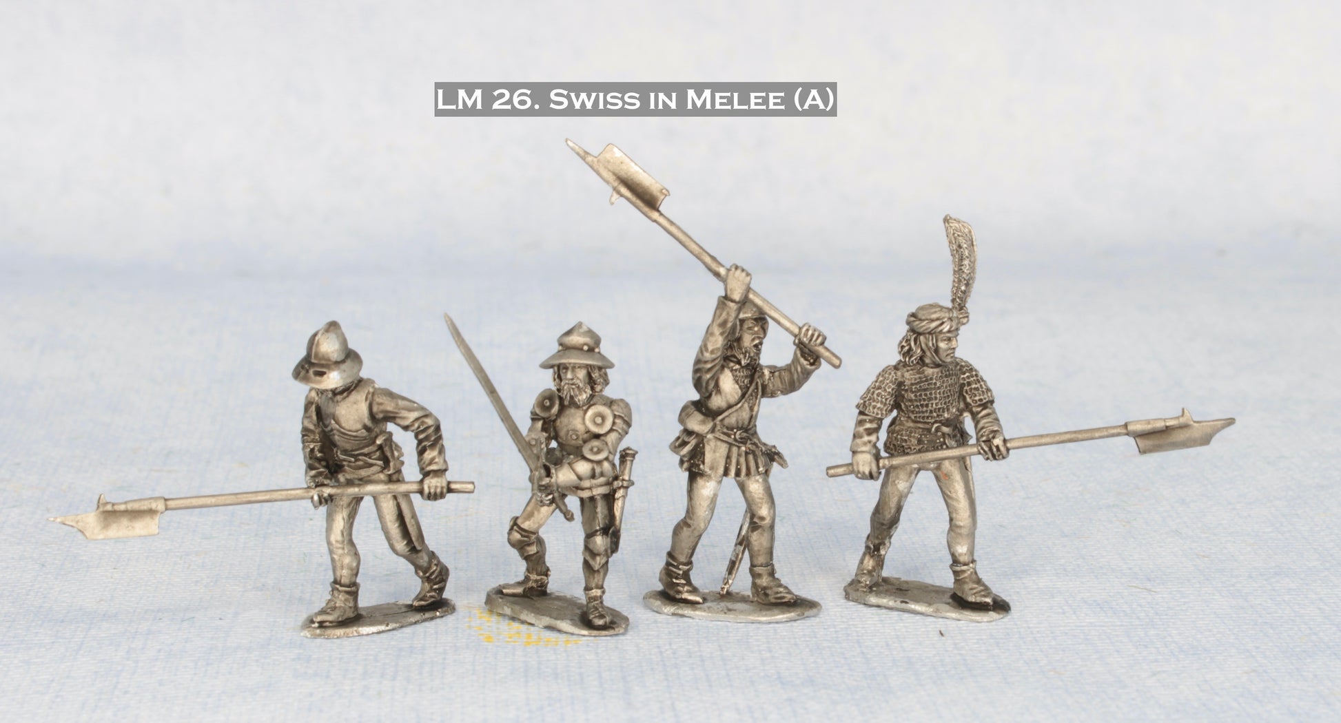 LM 26. Swiss in close melee. Four figures fighting with halbards and double-handed sword. Figures come with separate heads, which are interchangeable. These figures represent Swiss in the Burgundian-Swiss wars and the 1460-1490 period.