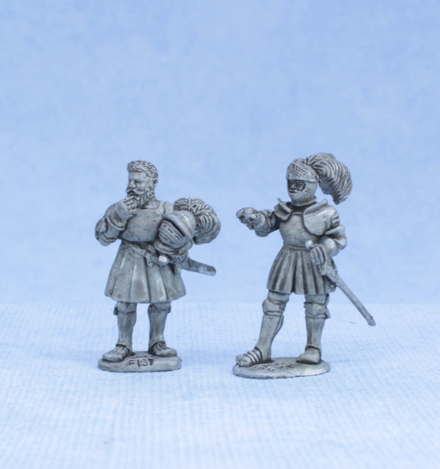The first figure has a cloth tunic covering his armour and he carries a burgonet.