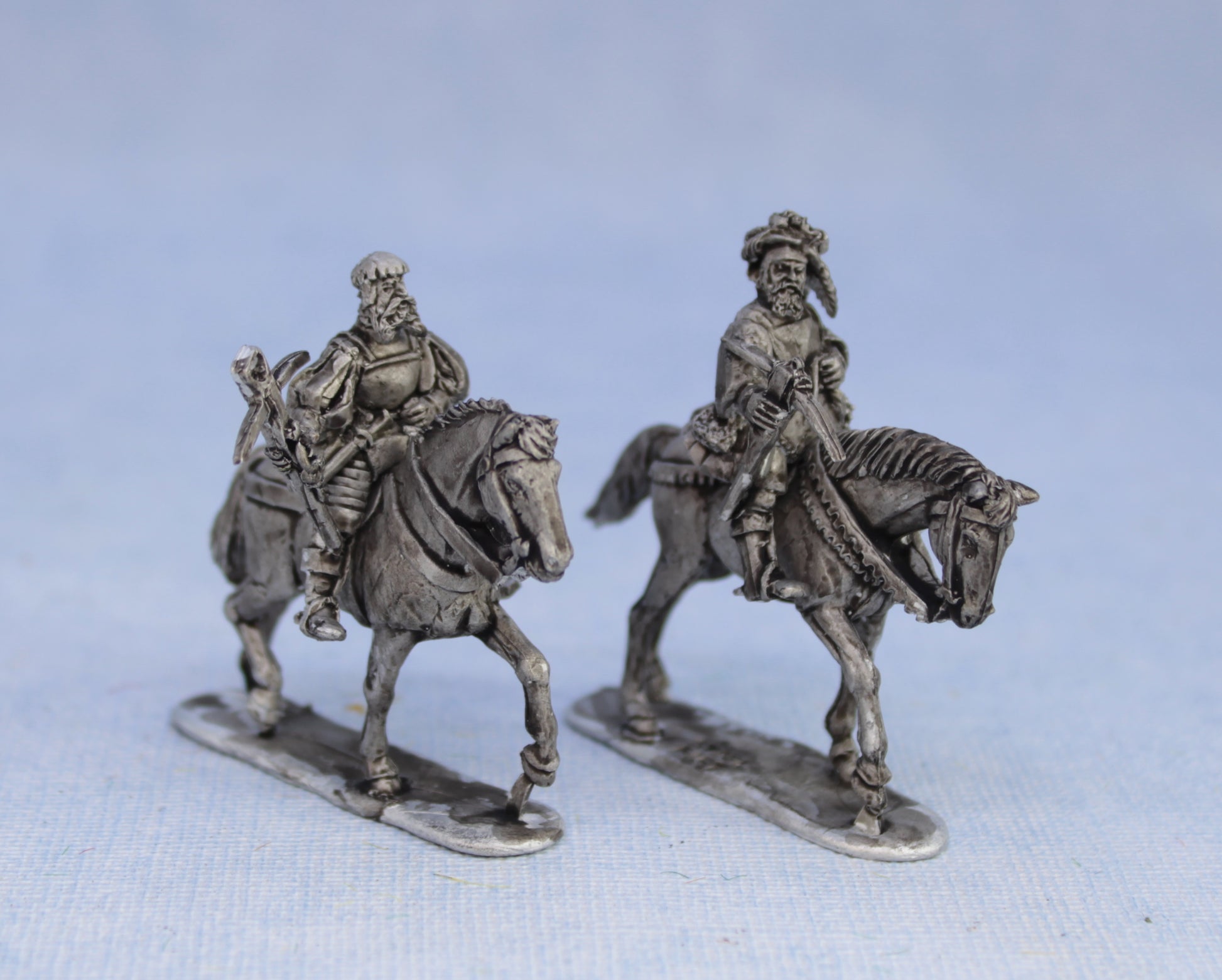 These figures represent crossbowmen for the Italian Wars, who rode on campaign and into battle mounted on horses, but who would most likely have fought on foot. Figures are now supplied with separate heads wearing soft hats and can be mixed with most other figures in this range. They are supplied with a random mix of horses.