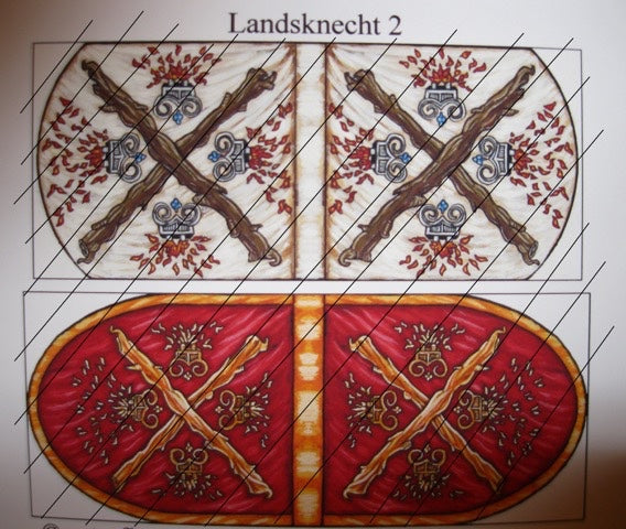 A sheet of 2 printed flags for Landsknechts in Imperial service, displaying arms of ‘Burgundian’ crosses.